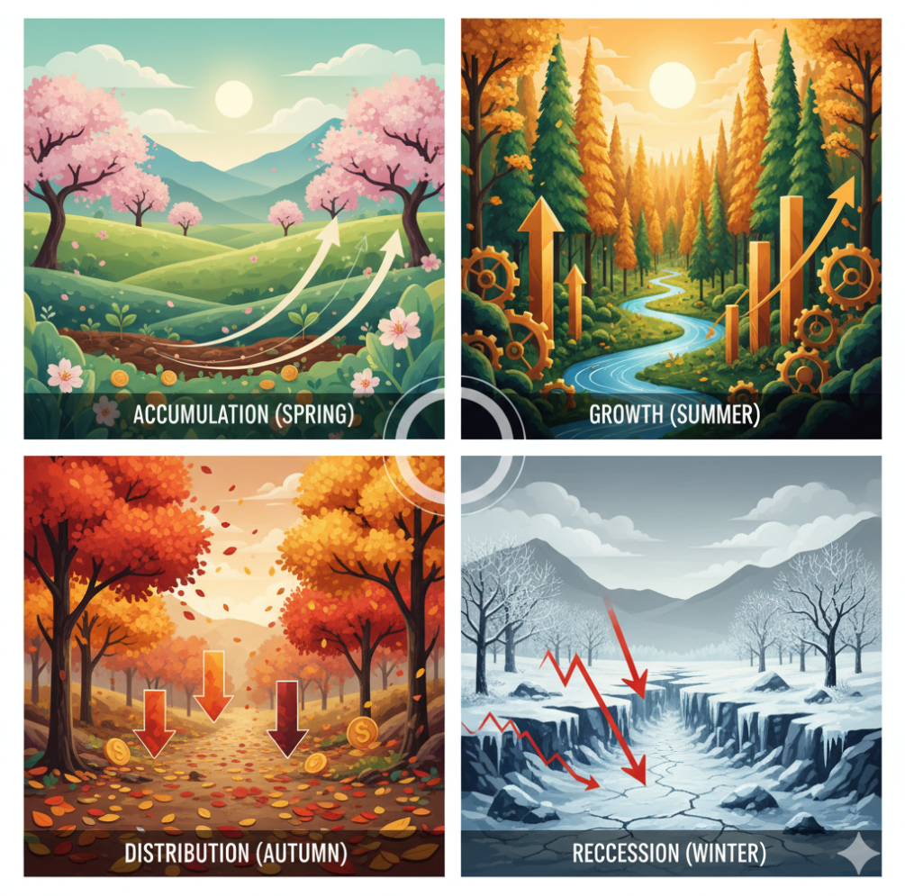 Câu trả lời không nằm ở việc đoán định thị trường theo từng ngày, mà nằm ở việc thấu hiểu bức tranh lớn hơn: nền kinh tế vận động theo chu kỳ. Giống như thời tiết có bốn mùa Xuân, Hạ, Thu, Đông, nền kinh tế cũng có các giai đoạn Tích lũy, Tăng trưởng, Phân phối và Suy thoái.