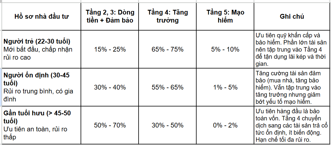 Quan trọng: Không có một công thức chung cho tất cả mọi người. Các con số dưới đây chỉ mang tính chất tham khảo. Bạn cần điều chỉnh linh hoạt dựa trên hoàn cảnh, mục tiêu và khẩu vị rủi ro của riêng mình. Tỷ lệ này được tính trên phần tài sản dùng để tích lũy và đầu tư, sau khi đã trừ đi chi phí sinh hoạt.