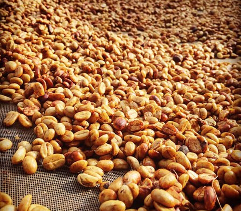 Sau khi hạt cà phê khô đạt độ ẩm chuẩn (10 – 12%), tiến hành loại bỏ lớp vỏ thóc để thu được nhân xanh.