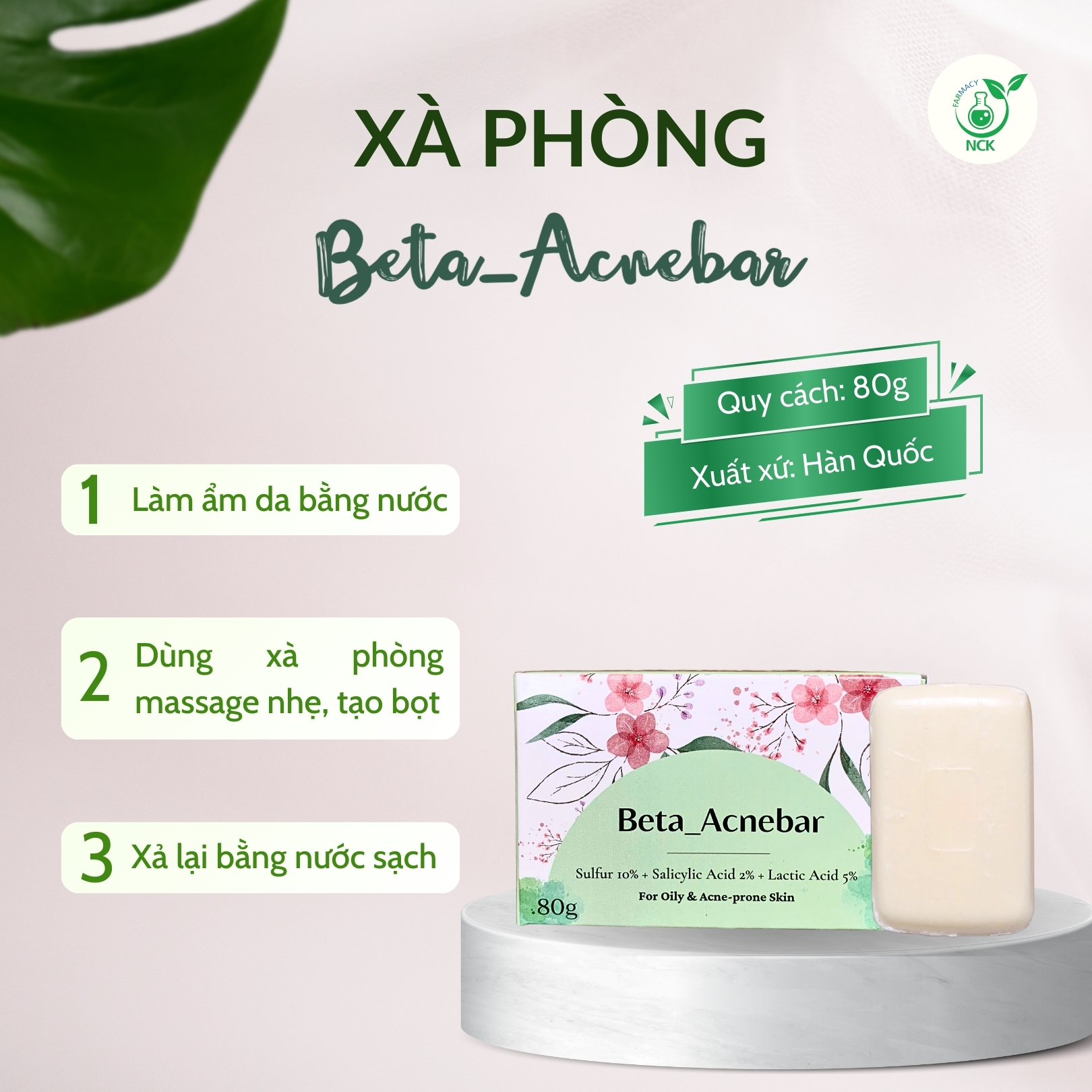 Làm ẩm da trước rồi dùng xà phòng Beta Acnebar massage nhẹ nhàng lên da để tạo bọt. Khi tạo đủ bọt thì xả sạch bằng nước đảm bảo không còn bọt nhờn trên da
