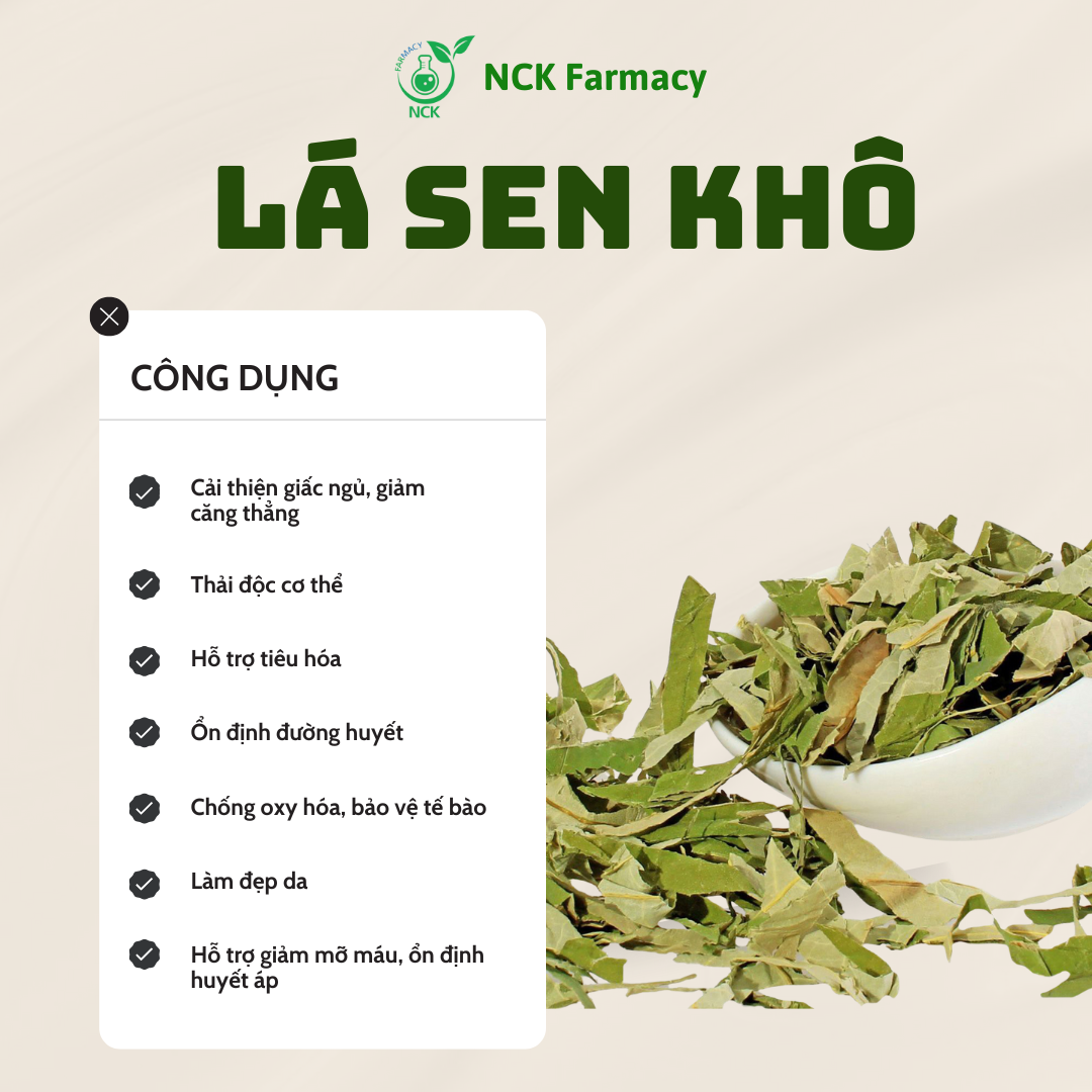 Thành phần chính: 100% lá sen khô (sấy lạnh hoặc phơi khô tự nhiên không hóa chất)